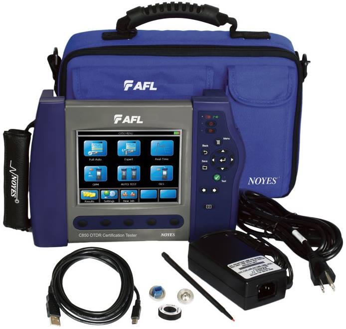 The Noyes C850 from AFL Telecommunications is a full-featured QUAD OTDR in a compact case with a large transflective touch screen display suitable for both indoor and outdoor operation. The C850 offers built-in auto test functionality when used with another C850 or the C840 QUAD Certification Tester. The C850 features MM and SM OTDR capabilities, both single-mode and multimode Optical Light Sources (OLS), Visual Fault Locator (VFL, 650 nm), and an Optical Power Meter (OPM). As an OTDR, the C850 supports Full Auto, Expert (manual) and Real-Time test modes, simultaneous dual and single wavelength testing, and Event and Pass/Fail analysis based on default or user-defined thresholds. Two C850s or a C840 Tester and C850 can be used together to perform Tier 1 dual wavelength MM (850/1300 nm) and SM (1310/1550 nm) auto tests of one or two fibers in one or both directions; and measure both loss and length of the fibers and compare to industry standards (TIA/ISO/EN), applications and userdefined thresholds values to certify the fibers. The user may test two fibers at two wavelengths bi-directionally and store the results into the main unit. Featuring rich file naming, the Job setup wizard allows the user to define both the cable and fiber end locations, creating easily identifiable trace files, which are managed into Job and Cable folders.
