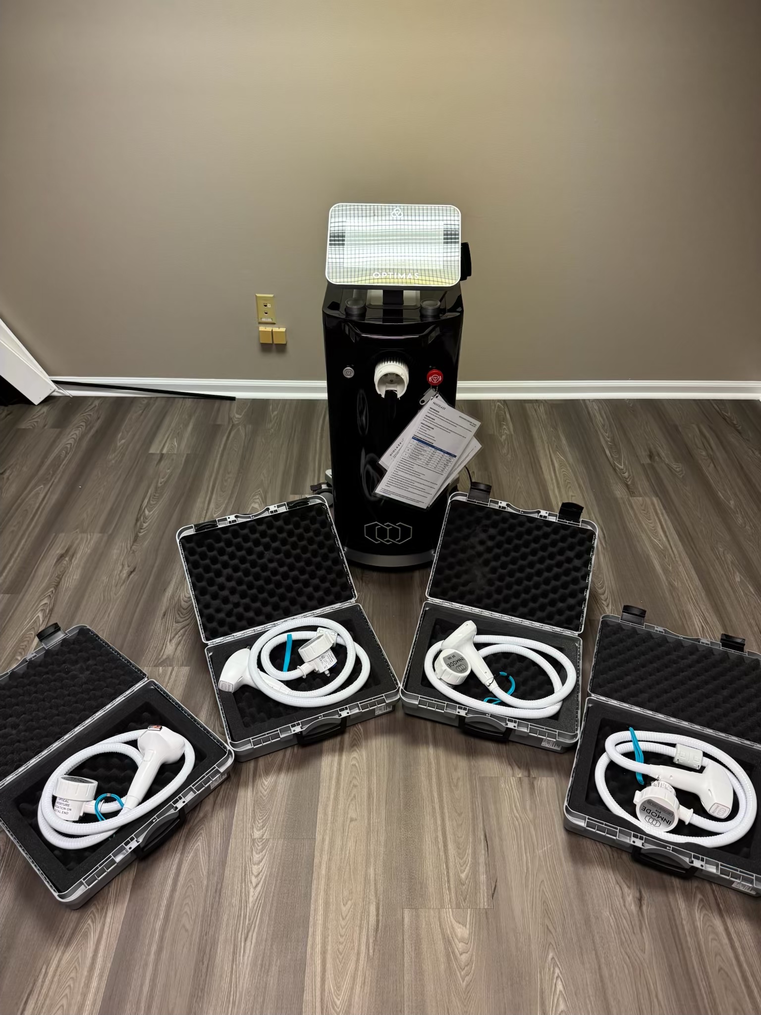 Inmode Optimas w/ 4 Handpieces – Diolaze Diode Hair Removal Handpiece, Lumecca 515 IPL Pigment & Vascular Lesions, & Vasculaze 1064nm Vein Removal.