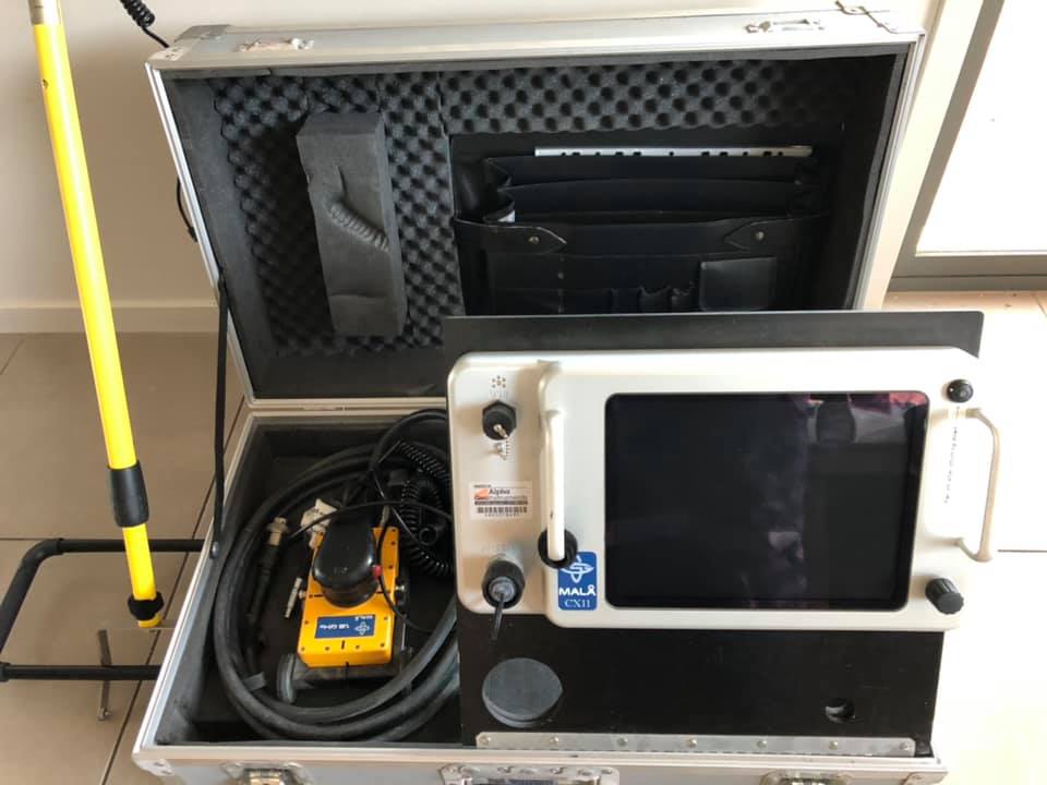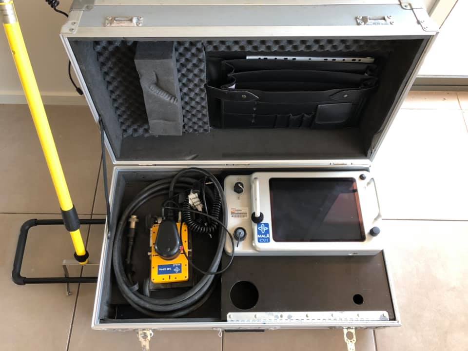 Mala CX11, 21-003950, Version: I2, Ground Penetrating Radar, GPR, finds pipe, rebar, metal, etc. under cement. Comes with 2.3 GHz Rolling Antenna, (rolls my hand while in cart), also comes with 12V power supply and AC cord to power unit directly through 120V outlet. Also comes with Mala Li-ion Portable Battery with its’ own charger. Unit comes with original Mala Heavy Duty rolling case (29″ x 17″ x 10″) and operating manual