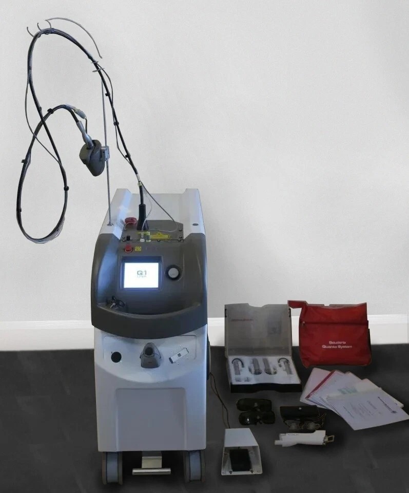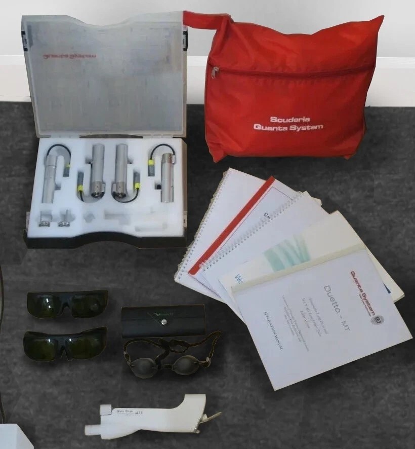 Quanta Duetto MT Alexandrite 755nm Nd:YAG 1064nm Laser Skin Veins Hair Removal includes: 1 x Quanta System Duetto MT Alexandrite 755nm Nd:YAG 1064nm Laser Skin Hair Removal, 1 x Handpieces In Storage Case, 1 x Skin Cryo Cooler Handpiece Holder Adapter, 1 x Set Of Manuals, 2 x Operator Goggles, 1 x Patient Goggles, 1 x Machine Cover and 1 x Foot Pedal.